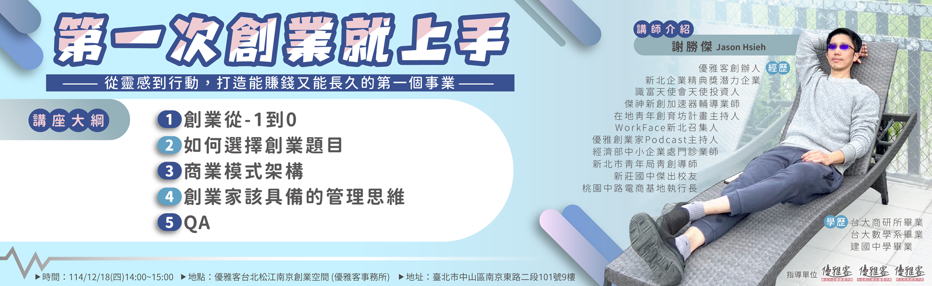於是創立優雅客新北台北橋創業空間,致力提供降低創業者門檻的軟硬體服務。